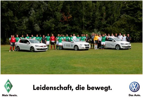 Der Autohersteller Volkswagen hat sein Engagement als Sponsor beim FuÃball-Bundesligisten SV Werder Bremen bis 2012 verlängert. Auch in den kommenden Jahren werden die Spieler in Bremen mit Fahrzeugen von Volkswagen ausgestattet. Seit 2008 liefert VW jedes Jahr neue Fahrzeuge an Trainer, Spieler und Verantwortliche des Bundesligisten. Besonders beliebt bei den Spielern sind vor allem das SUV Touareg sowie der sportliche Golf GTi.AuÃerdem plant VW eine Ausweitung der Fanaktionen rund um die Heimspiele von Werder Bremen, die künftig noch stärker vom Automobilhersteller aus Wolfsburg unterstützt werden sollen.
