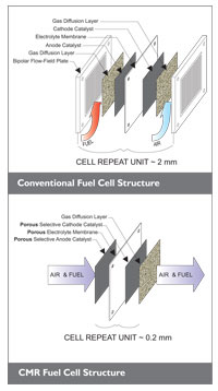 Cmr_stack La start-up CMR Fuel Cells annonce vouloir commercialsiser une pile à combustible pour PCs très prochainement. CMR déclare que la mise au point de leur stack est maintenant achevée et que les efforst se concnetrent sur le passage à la production série. Leur technologie « Compact Mixed Reactant« , qui est aussi à l’origine du nom de la société, permet une gestion optimisée du fuel sous forme de gaz et de l’oxygène de l’air ambiant. La subtilité se situe dans la manière d’empiler le stack. L’utilisation de fuel ainsi obtenue permet à la pile de fonctionner avec un rendement accru et de donner jusqu’à quatre jours d’autonomie entre deux recharges.  Selon le président de CMR, John Halfpenny, « la technologie de CMR présente un saut technologique dans le domaines des accumulateurs, comparable à celui du transistor au circuit intégrés! ».