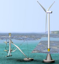– elles sont beaucoup plus petites pour une même puissance: (la photo ci-contre montre une éolienne et une hydrolienne de même puissance, à la même échelle), cela étant dû à la masse volumique de l’eau 800 fois supérieure à celle de l’air.