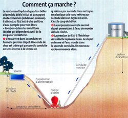 Une arrivée d’eau ferme un premier clapet, qui crée une onde de choc, qui en ouvre un deuxième qui comprime de l’air dans une chambre. L’air repousse l’eau dans une canalisation de sortie et recommence le cycle.