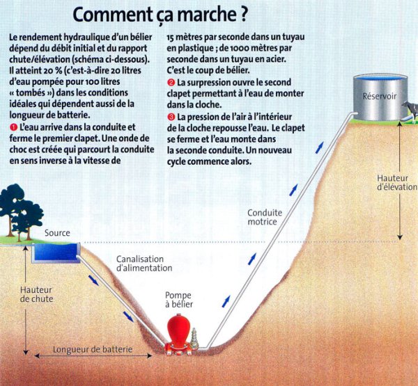 Le bélier de montgolfier a toute les qualités : peu coûteux, quasi inusable, d’un coût d’utilisation nul, et d’une maintenance plus qu’aisée. Il souffre cependant d’un défaut, il n’atteint qu’un rendement de 20% (20 litres remontés pour 100 arrivés)