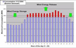 Un projet nommé « Night Wind » associant Hollandais, Danois, Bulgares et Espagnols se propose d’apporter un début de réponse à ce problème. L’idée est simplissime: utiliser l’énergie éolienne produite la nuit, soit une période de faible demande en électricité, pour refroidir des entrepôts frigorifiques de l’ordre de 1°c en dessous de leur température usuelle. La journée, alors que la demande est supérieure, les entrepôts laissent la température remonter jusqu’à la température initiale.