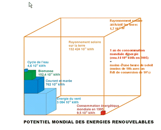 Potentiel_energies_renouvelablesLe petit cube rouge représente la consommation d’énergie globale actuelle, face aux potentiels du renouvelable. Pour l’exploiter, le sénat dit :