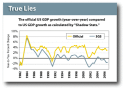 Les stocks d’essence US prennent la même route que les chiffres de la croissance. Le trucage. En effet, on voit sur la courbe ci-contre, la croissance US (en Jaune), et l’ancienne manière de calculer. Clairement, la stagnation est installée depuis 1990, puis la recession depuis 2000. La manipulation des comptes a remplacé la stagflation par la croissance.