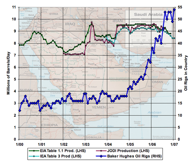 Les champs pétroliers d’Arabie Saoudite déclinent. Cette courbe le montre clairement. En bleu le nombre de puits. Jusque là, le nombre de puits dans la péninsule arabique était trés mesuré. Quelques centaines, à comparer à la boulimie de forage US (500 000), qui n’a pas empêché pourtant la production de décliner de moitié depuis 1971. On voit que les 3 courbes représentant la production piquent du nez. C’est trop peu, ou c’est trop. En effet, souvent l’Arabie a