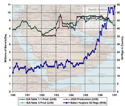 joué un rôle de régulateur, mais les pics, et les creux étaient beaucoup plus accusés que cela. Et déjà, on voit depuis 2005, un accroissement vertigineux des forages… Pour une simple stabilisation…Ghawar a fourni depuis 1948 pas loin de 5 000 000 de barils/jour. Il est normal que cela finisse un jour.Simple question de bon sens. Les autres petits gisements (40 % de la production) augmentent encore leur production, mais cela restera de toute façon insuffisant. Les saoudiens prouvent d’ailleurs qu’ils pensent à l’aprés pétrole ; ils produisent de plus en plus de gaz… Objet de leur mépris pendant des décennies. Nuisance à brûler dans des torchéres, sans regrets.