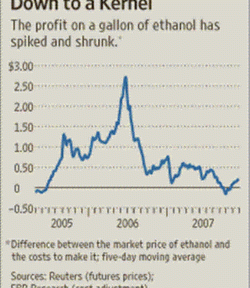 Les cours de l’éthanol aux USA se sont fortement repliés en raison de la surproduction. Le gallon valait 5$ en Juin 2006, il n’en vaut plus que 1.85 $ maintenant. Pendant ce temps l’essence qui valait 2.1$/gallon en Juin 2006 se négocie à 2.4$/gallon en ce moment surv le NYMEX. Il n’est pas nécessaire d’avoir fait de longues études pour comprendre que plus un raffineur va mettre de l’éthanol dans son essence et plus il va faire de la marge, surtout si l’on sait qu’il va être de plus crédité d’un avoir de 51 cents sur ses taxes indirectes, pour tout gallon d’alcool utilisé comme additif. On estime le montant de ce crédit d’impôt octroyé aux raffineurs US à 3.5 milliards de dollars pour cette année.