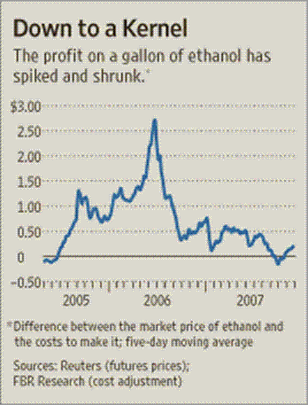 Les cours de l’éthanol aux USA se sont fortement repliés en raison de la surproduction. Le gallon valait 5$ en Juin 2006, il n’en vaut plus que 1.85 $ maintenant. Pendant ce temps l’essence qui valait 2.1$/gallon en Juin 2006 se négocie à 2.4$/gallon en ce moment surv le NYMEX. Il n’est pas nécessaire d’avoir fait de longues études pour comprendre que plus un raffineur va mettre de l’éthanol dans son essence et plus il va faire de la marge, surtout si l’on sait qu’il va être de plus crédité d’un avoir de 51 cents sur ses taxes indirectes, pour tout gallon d’alcool utilisé comme additif. On estime le montant de ce crédit d’impôt octroyé aux raffineurs US à 3.5 milliards de dollars pour cette année.