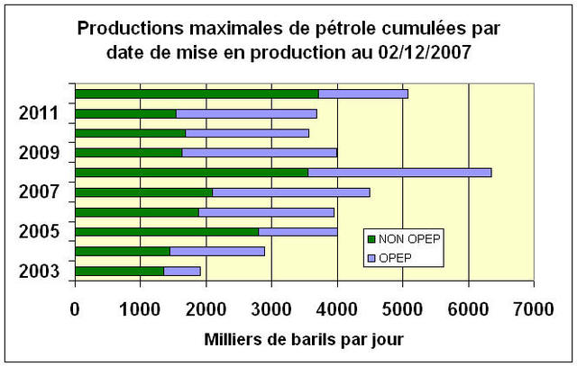 Les mises en productions 2003 (1,9 mbl/jour) et 2004 (2,9 mbl/jour) ont été faibles, résultantes des sous investissements des Sociétés pétrolières lorsque le baril de pétrole se négociait à 20$ le baril. A partir de 2005 on constate une accélération pour atteindre un maximum en 2008 à 6,3 mbl/jour.