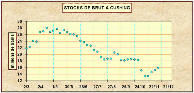 Mais le point clé qui explique le calme « olympien » des marchés c’est la lente remontée des stocks de brut à Cushing, malgré la baisse des stocks dans la zone du Golfe du Mexique. Ils étaient en fin de semaine dernière (S48) à 15,9 millions de barils, en croissance de 0,7 million.