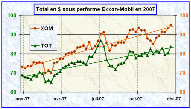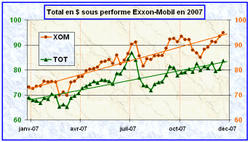Totxom1                        L‘année 2007 aura été marquée par un formidable jaillissement des cours du pétrole partant de 50$/baril au mois de Janvier et finissant quasiment au plus haut à 96$/baril en Décembre. Les cotations des Groupes pétroliers en Bourse ont profité dans l’ensemble de ce mouvement d’appréciation, mais avec des amplitudes diverses. Ainsi, l’action Exxon-Mobil qui est la référence dans le monde des Sociétés pétrolières diversifiées indépendantes, a progressé sur l’année de 24% (95$/77$). Son cours a accusé la crise boursière du mois d’Août, mais il s’est rapidement repris au troisième trimestre avec l’envolée des cours du brut. L’action Total, répliquant en dollars à Wall Street (TOT) la cote de Total sur le CAC (FP), a pour sa part réalisé un score plus modeste avec une progression de 16% (84$/72$). Après un remarquable rallye au T2, atteignant un plus haut à 87$ à la mi-Juillet et la forte chute du mois d’Août, le cours s’est repris mais n’a pas su retrouver son cours du mois de Juillet, malgré des résultats opérationnels de Total les meilleurs parmi ses pairs.