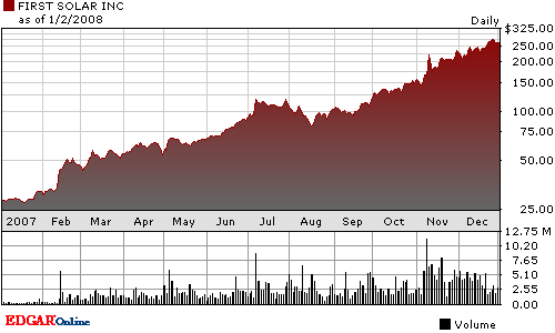 S’il est une start-up dont on parle dans de nombreuses analyses boursières américaines c’est FIRST SOLAR (FSLR). C’est une Société spécialisée dans la production de panneaux solaires en couches minces à base de Tellurure de Cadmium ( Thin Film CdTe) une des technologies qui révolutionnent l’industrie des panneaux solaires économiques par la non utilisation de lingots de Silicium au cours du procédé de production. Le cours de cette Société est, on le voit sur le graphique, poussé par une très forte spéculation. Son PER (price earning ratio ou rapport cours/bénéfice par action) est aux environs de 200. Mais il existe cependant de plus en plus d’observateurs qui préconisent la prudence sur cette action pour plusieurs raisons.