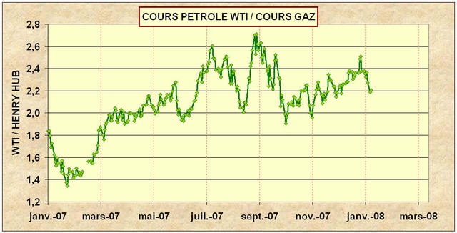 Les prix du gaz naturel connaissent une embellie internationale. L’unité anglo-saxonne de valorisation est en dollars par million de British Thermal Unit (MMBTU) et un MMBTU représente l’équivalent énergétique de 0.17 barils de pétrole. Le MMBTU de gaz naturel vaut actuellement 8$ à New York (soit 47$/baril), il est proche des plus hauts à Londres à 10$/MMBTU ou 59$/baril. En Asie le gaz naturel liquéfié atteint des records à 18$/MMBTU ou 105$/baril. Cette envolée des cours du GNL est due à la demande hivernale mais aussi à une rafale d’incidents dans les usines de liquéfaction au Nigeria, en Norvège, en Egypte, en Australie. Cette revalorisation des prix du gaz naturel corrige une partie du déséquilibre de ses cours par rapport à celui du pétrole, mais sur le Nymex les cours du pétrole sont encore à plus du double de ceux du gaz.