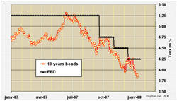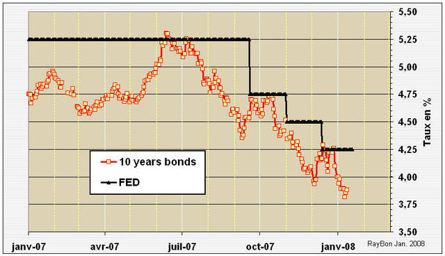 Les taux longs américains ont amorcé un repli depuis le mois de Juillet 2007 anticipant ainsi la baisse par paliers des taux administrés par la FED. Par exemple le Bond à 10 ans venant de 5.3% en Juillet dernier est maintenant proche des 3.8%. Ce repli qui s’explique par l’anticipation des baisses de taux de la FED et par l’existence de liquidités provenant des investisseurs qui fuient les hypothèques douteuses et qui réduisent la pondération en actions de leur portefeuille. Mais il s’explique aussi par la non anticipation par le Marché US de futur mouvement inflationniste de grande ampleur.