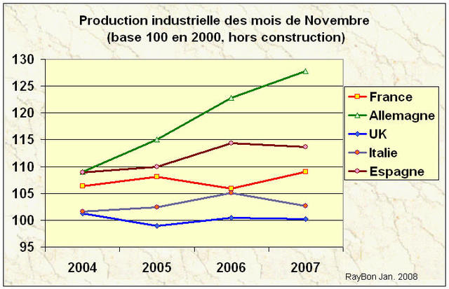 On constate sur la base des indices que seule l’Allemagne présente une courbe de progression régulière sur cette période. Les autres grandes nations, même l’Espagne sont larguées. La Grande-Bretagne n’a pas changé d’un iota en sept ans, c’est une puissance purement commerciale et financière. Les chiffres italiens ne veulent pas dire grand chose mais ils sont mauvais. La France à l’indice 109 « progresserait », inflation comprise de 1% par an, impact des 35 heures, du principe de précaution, des fermetures de pans entiers de l’industrie manufacturière, somnolence de l’industrie automobile: l’industrie française va mal. L’Espagne au même niveau que l’Allemagne en 2004 se laisse décrocher et stagne même entre 2006 et 2007.