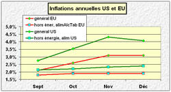 La comparaison des inflations annuelles sur les quatre derniers mois connus aux USA et en Zone Euro montre que l’inflation US a été supérieure d’un point environ à son homologue européenne. Inflation européenne de 3.1% en Décembre et de 4.08% aux USA. Ces inflations hors alimentation et énergie qui sont deux postes importants en ces périodes, se rapprochent: 1.9% en Europe contre 2.4% aux USA en Décembre.