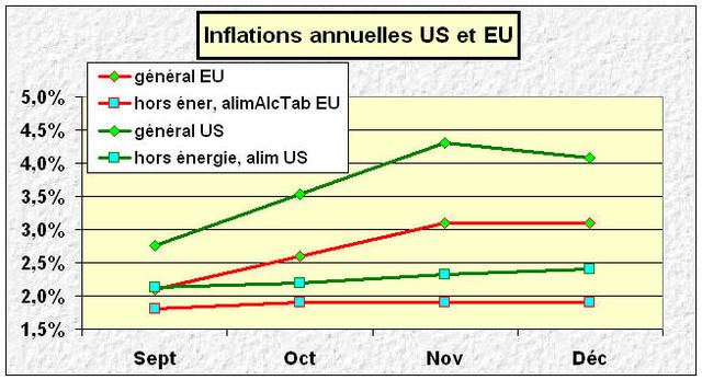 La comparaison des inflations annuelles sur les quatre derniers mois connus aux USA et en Zone Euro montre que l’inflation US a été supérieure d’un point environ à son homologue européenne. Inflation européenne de 3.1% en Décembre et de 4.08% aux USA. Ces inflations hors alimentation et énergie qui sont deux postes importants en ces périodes, se rapprochent: 1.9% en Europe contre 2.4% aux USA en Décembre.