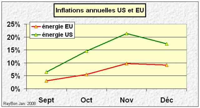 La stabilisation à la baisse des cours du pétrole raisonnablement prévisible en ce début d’année 2008 devrait faire baisser le poste énergie et ramener les inflations vers leur niveau hors énergie actuel.