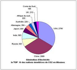 Co2ht1                   A la consommation d’électricité est associée une certaine quantité de CO2 qui va être d’autant plus importante que la proportion de générateurs thermiques à flamme sera élevée et que la vétusté des installations sera grande. Le site carma.org recense, centrale par centrale les émissions de CO2 et leur production d’électricité dans le monde. Après consolidation par pays il est possible les classer par émissions de CO2 décroissantes. Les USA sont leader avec 2790 Millions de tonnes de CO2 émises annuellement, talonnés et bientôt dépassés par la Chine (2680MT). La Russie arrive loin derrière, suivie de L’inde, du Japon et de l’Allemagne notre modèle écologique. La France n’est que 29ème dans ce classement des Nations les plus « électro-polluantes ».