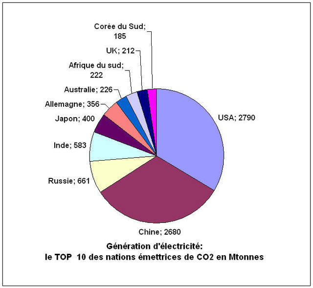 Co2ht1                   A la consommation d’électricité est associée une certaine quantité de CO2 qui va être d’autant plus importante que la proportion de générateurs thermiques à flamme sera élevée et que la vétusté des installations sera grande. Le site carma.org recense, centrale par centrale les émissions de CO2 et leur production d’électricité dans le monde. Après consolidation par pays il est possible les classer par émissions de CO2 décroissantes. Les USA sont leader avec 2790 Millions de tonnes de CO2 émises annuellement, talonnés et bientôt dépassés par la Chine (2680MT). La Russie arrive loin derrière, suivie de L’inde, du Japon et de l’Allemagne notre modèle écologique. La France n’est que 29ème dans ce classement des Nations les plus « électro-polluantes ».