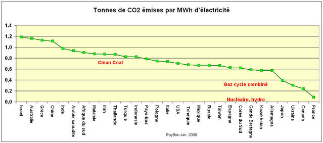 • à l’opposé, les nations qui émettent moins de 400 kg de CO2 par MWh avec le Japon, l’Ukraine, le Canada et la France bonne dernière qui n’émet que 81 kg par MWh d’électricité. Ces pays sont des leaders de génération électronucléaire ou hydroélectrique.