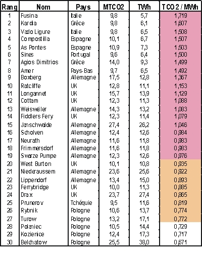 Electricite                                                                  L’Europe dispose d’un parc de centrales électriques thermiques à flamme important. Parmi les trente centrales les plus polluantes publiées sur le site Carma.com, 9 sont allemandes, 7 sont britanniques et 5  sont polonaises; puis viennent la Grèce, l’Espagne et l’Italie. Ces trente centrales génèrent annuellement  406 millions de tonnes de CO2 pour une production électrique de 405 TWh. Elles produisent donc en moyenne une tonne de CO2 par TWh d’électricité produite. Sur ces trente centrales 19 d’entre elles génèrent plus de 0,96 tonnes de CO2/TWh qui est la valeur admise pour une centrale au charbon classique. Ce sont donc des équipements de conceptions périmées. Puis viennent 8 centrales qui génèrent plus de 0,77 tonne de CO2/TWh qui est la valeur d’émission d’une centrale moderne au charbon dite « clean coal »; elles méritent donc elles aussi une remise à niveau.