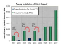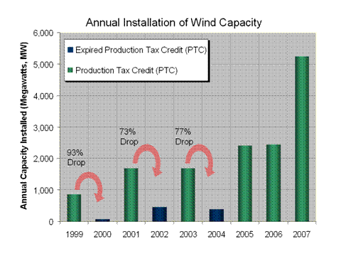 L’American Wind Energy Association est inquiète. Après un record d’installation d’éoliennes aux USA en 2007 de plus de 5200 MW pour un investissement global de 20 milliards de dollars, l’association professionnelle des industries éoliennes se fait du souci. En effet les subventions (« credit taxes ») aux électricités éoliennes ou solaires sont prévues jusqu’à la fin de l’année. Il faut donc, de toute urgence que le Congrès vote une prolongation de ces subventions au delà de la fin 2008, sous peine d’un assèchement des commandes, comme cela s’est produit en 2000, 2002 et 2004 (FIG.). Les lobbies éoliens et solaires sont fortement mobilisés pour que 2009 ne soit pas une année noire.