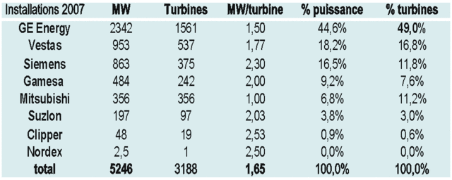 Le nombre d’éoliennes installées en 2007 a atteint 3188 soit 3,6 fois plus qu’en Allemagne. La puissance nominale de 5246 MW est plus de trois fois celle installée en Allemagne. Il faut toutefois remarquer que la puissance moyenne par éolienne installée est de 1,65 MW (contre 1.89 MW en Allemagne). En effet le standard US est l’éolienne de 1.5MW de GE Energy qui représente près de la moitié des aérogénérateurs installés. C’est le grand gagnant de cette croissance, avec un doublement de la puissance installée par rapport à 2006. GE a standardisé sa production autour d’une éolienne de 1.5MW dont il a installé 7700 exemplaires dans le monde. Il espère en avoir installé plus de 10000 en cumulé à fin 2008. Le chiffre d’affaire éolien mondial de GE Energy a atteint 4 milliards de dollars en 2007.