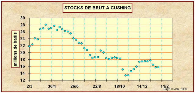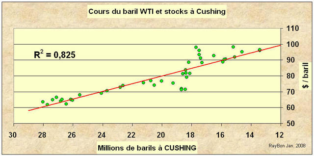 Il existe depuis près de 10 mois une corrélation entre les stocks à Cushing est les cours du WTI sur le Nymex.