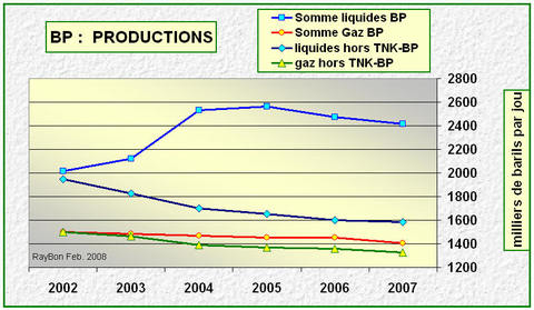 Les productions globales de liquides (pétrole + condensats) ont progressé entre 2002 et 2005 puis ont décru en 2006 et 2007. Le tableau est totalement différent si les productions de liquides de la filiale russe TNK-BP sont déduites. On obtient alors une production de liquides en régression continue depuis cinq ans.