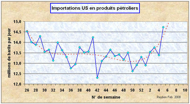 Les très fortes importations US de pétrole brut et de produits raffinés ont entraîné les stocks, la semaine dernière à la hausse. Les importations se sont élevées à 14.7 millions de barils par jour pour une valeur moyenne de 13.5 millions bl/jour. Cet accroissement de stock se retrouve dans les stocks de pétrole brut (+7.1 millions de barils) et dans les stocks d’essence (+3.6 millions de barils). Les stocks de fuel restent stables, ceux de propane baissent de 3.9 millions de barils.