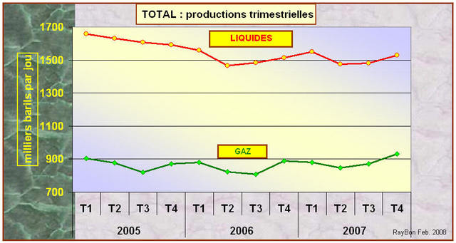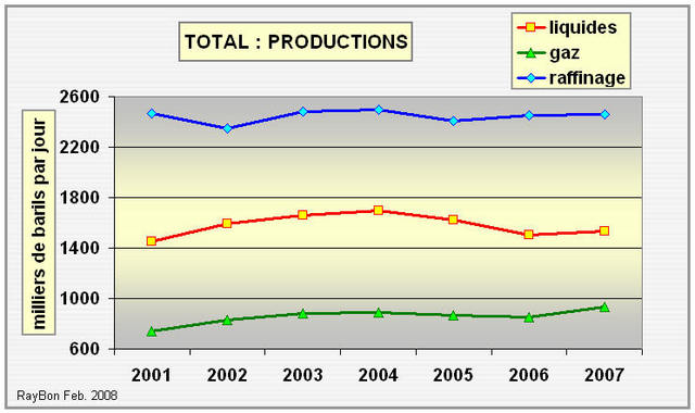 montre la stabilisation des volumes de liquides produits depuis mi-2006 autour de 1,5 millions de barils par jour. Depuis cette même date les productions de gaz croissent et ont même dépassé 0,9 million de baril équivalent par jour.