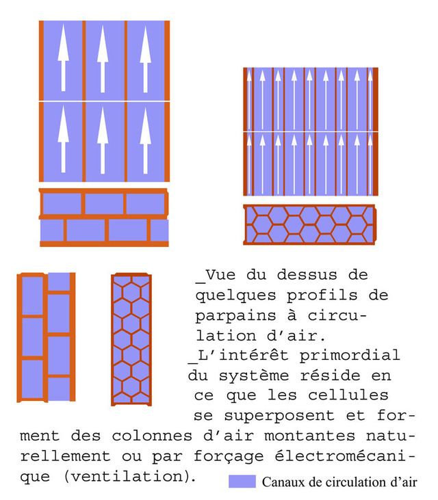 Voilà, là aussi une invention de C.Verna. C’est une ventilation des murs , qui sert à chauffer et à tempérer, mariable à un puit provençal, comme à une ventilation mécanique.