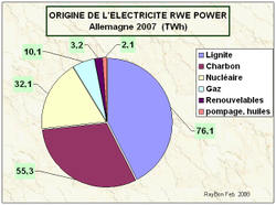 L’essentiel de ses productions d’électricité allemandes sont obtenues à partir de Lignite locale (42%) et de Charbon (31%). Un sixième des volumes produits est issu des centrales électronucléaires qui ont été arrêtées plus que de coutume en 2007.Rweprod2 Les énergies renouvelables avec 3,2 TWh ne représentent que moins de 2% de la production de RWE. L’entreprise allemande produit en moyenne 882 kilogrammes de CO2 par MWh d’électricité produite et en faisant abstraction de la partie nucléaire et renouvelable qui ne produisent pas de CO2, les centrales thermiques à flamme de RWE qui assurent 80% de ses productions d’électricité, produisent 1099 kilogrammes de CO2 par MWh, ce sont des ratios chinois.