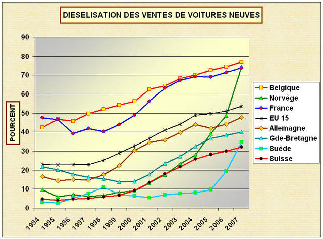 Il est à noter le fort rattrapage de la Suède qui est passée en deux ans de 10% à 35% de voitures diesel vendues et surtout le bond de la Norvège qui en quelques années à atteint le taux de la France. Pour la Suéde ce changement de choix de motorisation s’explique par l’abandon par le gouvernement suédois d’une taxe annuelle de 6000 couronnes pour les voitures diesel équipées d’un filtre à particules à partir du 1/01/2008.