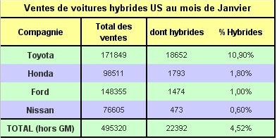 Autodata a publié les ventes US de voitures hybrides par type dans le courant du mois de Janvier 2008. Il ressort de ces chiffres que les ventes de voitures hybrides de Toyota représentent 83% des ventes des plus de 22000 véhicules vendus. La Prius avec 11379 exemplaires se taille la part du lion des ventes, soit plus de la moitié.
