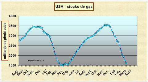 Les cours du gaz naturel aux USA se sont tendus à l’annonce de la baisse des stocks et de la persistance du froid.Gazus2 La température à Chicago est de -2°C, les stocks de gaz naturel ont atteint les niveaux bas de fin de cycle, alors les cours se tendent  au Henry Hub. Ils dépassent gaillardement les 9$ par millions de BTU depuis quelques jours. Cette tendance à la hausse pourrait se poursuivre si le froid devait persister. Rappelons que les cours avaient dépassé les 15$/MBTU en 2005 lors des tornades Rita et Katrina. Les fluctuations des cours du gaz US peuvent être très fortes en périodes de pénurie potentielle et de forte spéculation.
