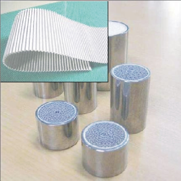 Le Groupe japonais FCC a mis au point un procédé très simple d’élaboration d’un support catalytique destiné à la purification des émissions de gaz de gaz combustion des moteurs à explosion. Le procédé consiste à élaborer par technique papetière à l’eau, un support de type feuille ondulée à base d’oxyde d’aluminium. Les catalyseurs à base de Manganèse et de Palladium sont incorporés durant le procédé d’élaboration de la feuille. Un traitement thermique assure une grande pureté de ce support présentant des pores de 10 à 20 microns de diamètre. Le pot catalytique est obtenu par enroulement du support et introduction dans une virole métallique.