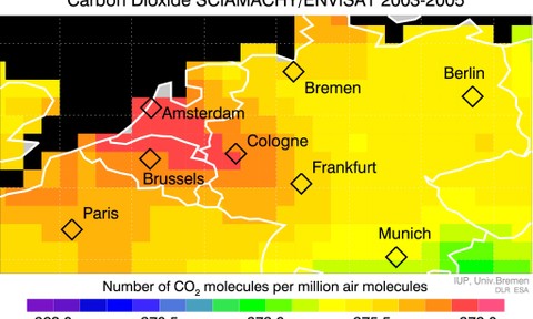 L’image de ces teneurs sur l’Europe du Nord étudiée par le Docteur Michael Buchwitz de l’Université de Brême a de quoi le déprimer. Cette image illustre la source formidable de CO2 qui s’étend d’Amsterdam à Frankfort.