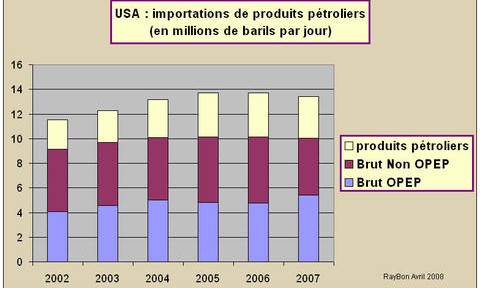 Selon l’Energy Information Administration les importations US de produits pétroliers à 13,44 millions de barils par jour auraient baissé en 2007 de 268 mille barils par jour par rapport à l’année précédente. Cette baisse ce décompose en une moindre importation de produits pétroliers de 167 mille barils par jour et une réduction des importations de pétrole brut de 101 mille barils par jour.