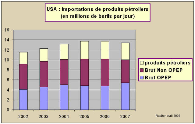 Selon l’Energy Information Administration les importations US de produits pétroliers à 13,44 millions de barils par jour auraient baissé en 2007 de 268 mille barils par jour par rapport à l’année précédente. Cette baisse ce décompose en une moindre importation de produits pétroliers de 167 mille barils par jour et une réduction des importations de pétrole brut de 101 mille barils par jour.