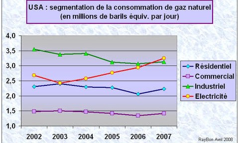 On note donc sûrement un transfert des consommations d’énergie des produits pétroliers très onéreux, vers le gaz naturel. La consommation de produits pétroliers ayant été stable en 2007, l’énergie supplémentaire consommée par les américains l’a été sous forme de gaz (+6,5%) et de charbon (+1,5%) pour essentiellement produire de l’électricité.
