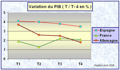 En conclusion: la décroissance de la variation du PIB allemand durant 2007 s’explique par une variation négative des dépenses des ménages et la baisse de la croissance des exportations, tempérée par le même mouvement de baisse de la croissance des importations. La bonne santé de l’Espagne s’explique par un bon niveau de croissance des consommations des ménages et de l’administration ainsi que des exportations. Quand à la France, une progression du pouvoir d’achat des salaires en 2007, lui a permis d’accroître légèrement les dépenses des ménages.