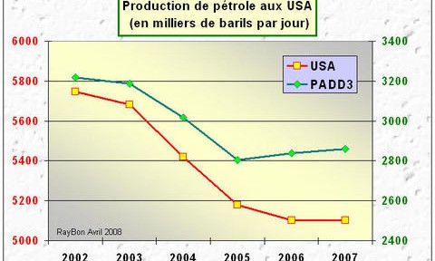Cette inflexion puis cette stabilisation des productions sont liées à l’accroissement des prix du baril de pétrole et à la reprise des investissements de prospection et de production. Ce phénomène de reprise est général sur tout le territoire américain. En Californie par exemple de la San Joaquim Valley jusqu’à Long Beach 2750 puits ont été forés en 2007 soit 20% de plus qu’il y a cinq ans. Le forage d’un puits coûte entre 350 et 550 mille dollars, mais à 100 dollars le baril il suffit de quelques dizaines de barils par jour pour obtenir une superbe rentabilité. L’autre paramètre est le reprise des productions dans la région du Golfe du Mexique dite PADD3 (FIG.) avec une reprise des productions offshore qui devrait s’accélérer en 2008 et 2009.