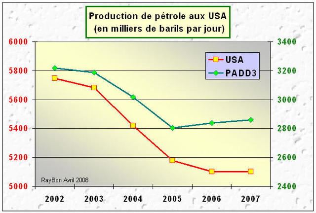 Cette inflexion puis cette stabilisation des productions sont liées à l’accroissement des prix du baril de pétrole et à la reprise des investissements de prospection et de production. Ce phénomène de reprise est général sur tout le territoire américain. En Californie par exemple de la San Joaquim Valley jusqu’à Long Beach 2750 puits ont été forés en 2007 soit 20% de plus qu’il y a cinq ans. Le forage d’un puits coûte entre 350 et 550 mille dollars, mais à 100 dollars le baril il suffit de quelques dizaines de barils par jour pour obtenir une superbe rentabilité. L’autre paramètre est le reprise des productions dans la région du Golfe du Mexique dite PADD3 (FIG.) avec une reprise des productions offshore qui devrait s’accélérer en 2008 et 2009.