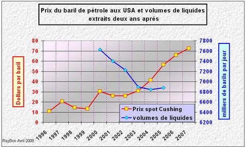 Depuis le mois de Mars 2000 on peut constater que le nombre de puits exploités aux USA est passé par un minimum de 882 unités en Avril 2002. Il est passé au dessus de 2000 en Novembre 2006, puis a légèrement décru avec la chute des cours qui a atteint un plus bas de 50$ le baril en Janvier 2007. Depuis le nombre de puits s’est redressé pour atteindre un plus haut de 2029 puits en Mars dernier.