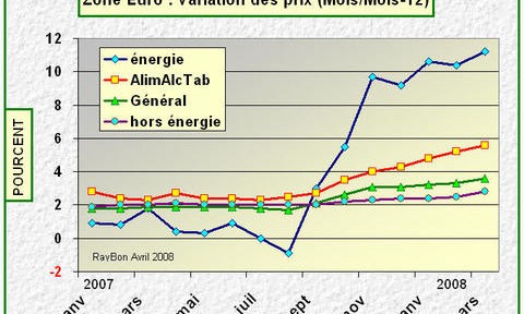 Les variations de prix sur un an de 3,6%, continuent de croître au mois de Mars dans la Zone Euro. Les Pays-Bas (1,9%), l’Allemagne (3,3%) et la France (3,5%) font partie des bons élèves. Par contre la Belgique (4,4%) et l’Espagne (4,6%) tirent la moyenne vers le haut. Les prix de l’énergie (+11,2%) et des produits alimentaires (+5,6%) tirent l’indice des prix vers le haut. Hors énergie, l’indice est à 2,8% et hors énergie et alimentation il est à 2%. Les seuls postes carburants pour les transports (+14,5%) et combustibles liquides (+36%) impactent l’indice de 0,77 points. La définition d’une politique énergétique européenne devient de plus en plus urgente.