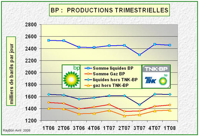 Les résultats trimestriels de BP font apparaître un profit de 7,6 milliards de dollars dont un milliard de valorisation de stock, à comparer aux 4,7 milliards du même trimestre 2007. La génération de cash des opérations à 10,9 milliards de dollars est elle aussi en forte croissance de 2,9 milliards de dollars. Ce bond qualitatif est obtenu à partir de productions stables de pétrole et de gaz (FIG.) et d’une activité de raffinage en progression.