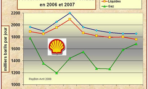 Royal Dutch Shell publie des résultats trimestriels globalement en progression mais tout de même assez ternes, compte tenu du contexte des prix des produits pétroliers. Les productions de liquides (pétrole+condensats+bitumes) à 1,853 millions de barils par jour sont en baisse de 5,5% par rapport à ceux du même trimestre 2007 qui étaient de 1,961mbl/jour. Ces baisses généralisées sont les plus fortes aux USA (-12%) en Asie (-10%), en Europe (-7%). Par contre les productions de gaz sont en croissance de 8,7% en raison d’une forte croissance des productions européennes de 19% (gisement d’Omen Lange en Norvège).