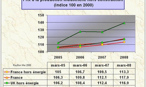 Les indices des prix à la production industrielle publiés par Eurostat en témoignent. Il suffit de comparer les indices (base 100 en 2000) des prix industriels hors construction avec et sans énergie et de les comparer avec ceux de la France en mars 2008 (FIG.). Alors que la variation de l’indice de la France comprenant les prix de l’énergie (17,9%) est majoré d’un tiers environ par rapport à la variation des prix hors composante énergétique (+13,3%). Pour la Grande-Bretagne les variations des prix à la production industrielle sont multipliés par 2,3 (39,5/16,9) par rapport à celle de l’indice sans composante énergétique.
